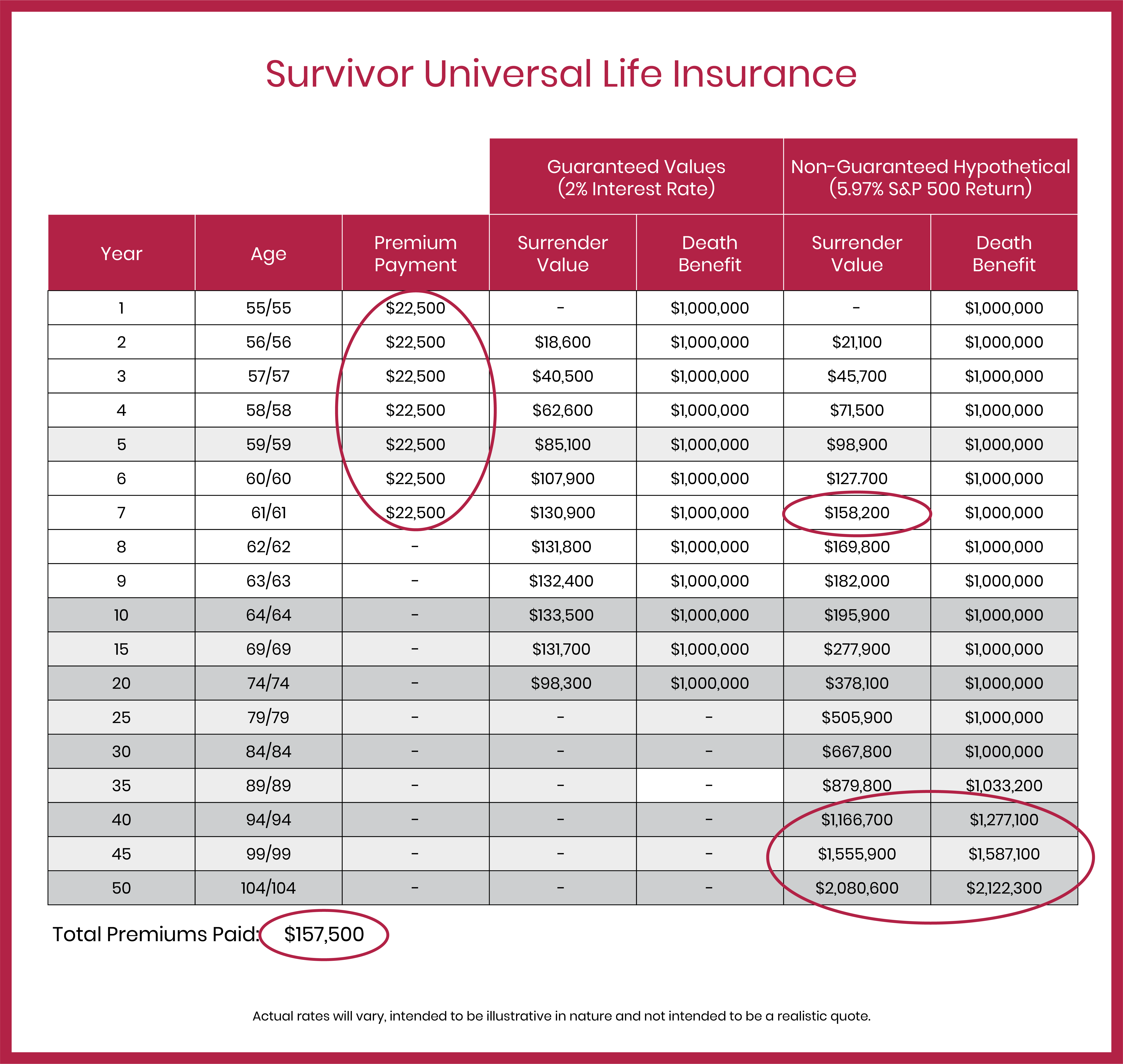 As with our Universal Life illustration, here we use a “7-Pay” policy, meaning the out-of-pocket premiums are only paid for the first 7 years. Thereafter the premiums are effectively paid out of the accumulated cash balance. Once the cash balance is drawn down completely (in the base-case/guarantee scenario), the policy lapses and there is no more death benefit. In the “Non-Guaranteed Hypothetical” scenario, where we assume a 5.97% annual return on the S&P 500, the cash value grows fast enough to pay the insurance premiums and contribute additional value to keep growing the cash value balance. As this surpasses the death benefit, the death benefit itself begins to rise roughly in line with the cash value, thus increasing the amount that can be left to the next generation tax-free.