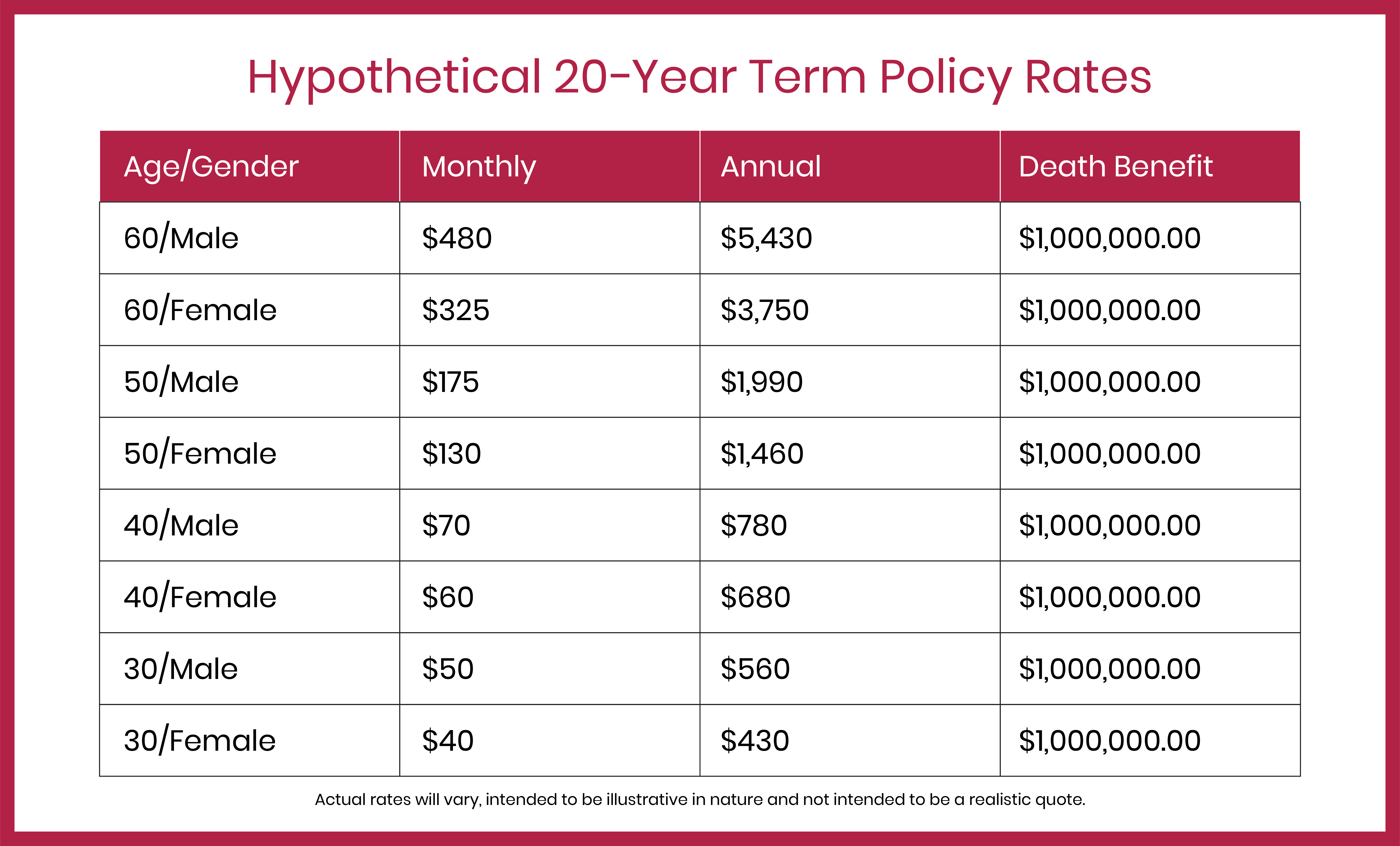 The table below shows hypothetical rates a 20-year policy with a $1,000,000 death benefit. The ages on the left are the age of the policyholder on the day the policy starts. For example, the last row reflects the policy premiums a woman aged 30 would pay each month or year to be covered until she turns 50 years old. The premium amounts stay fixed throughout the term.