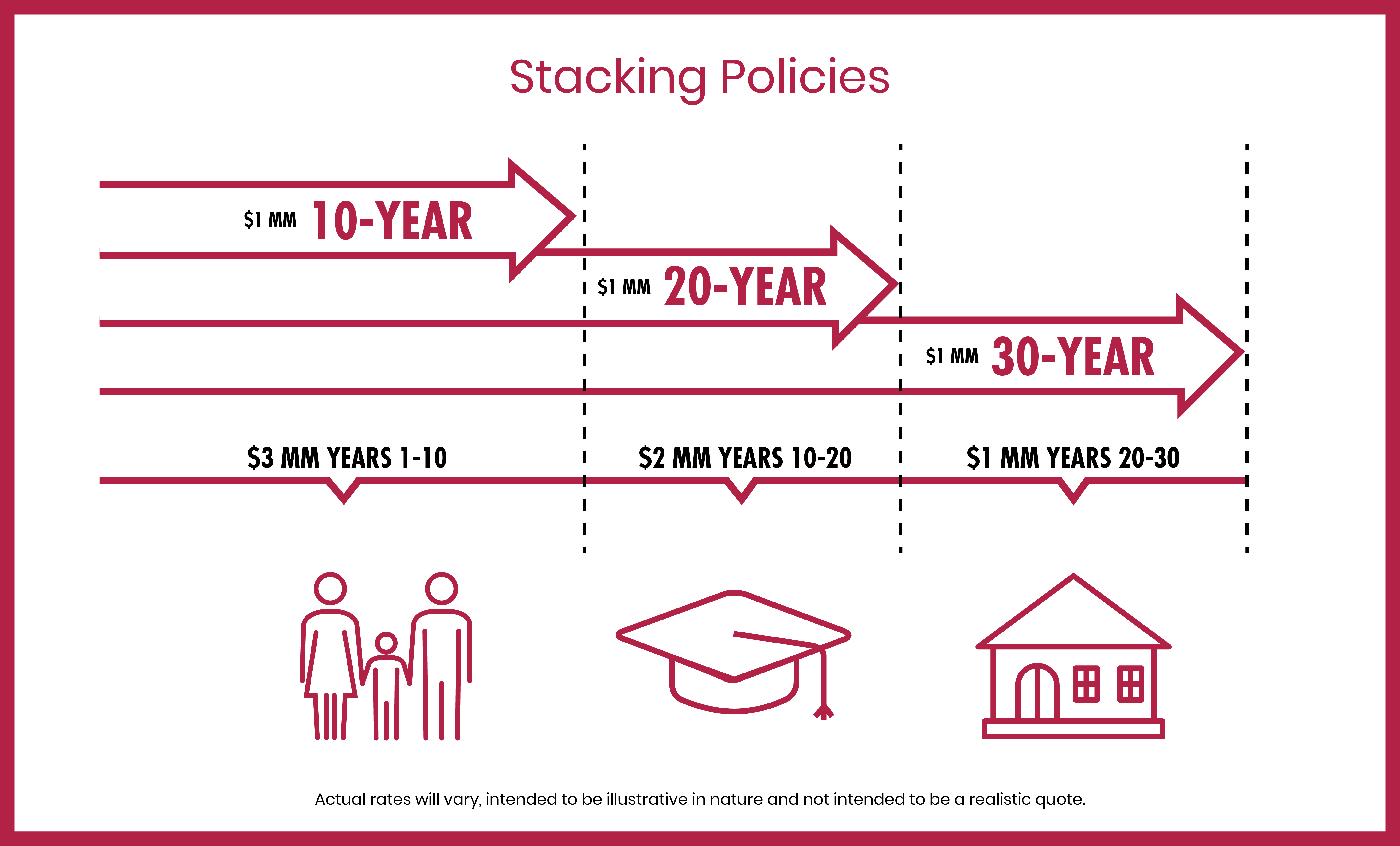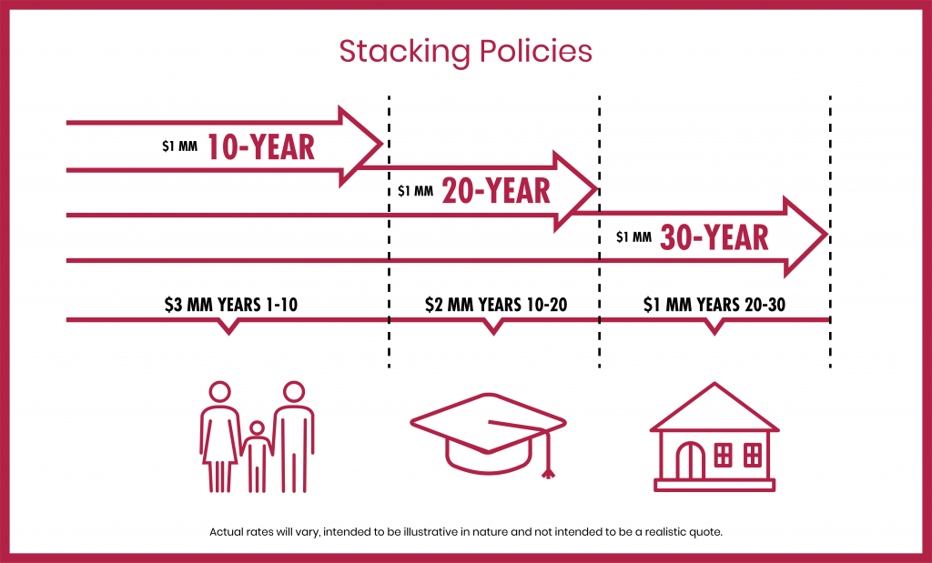 Multiple term policies can be combined or “stacked” to create a total payout that matches the changing needs of a family over time. For example, you could combine 30-year, 20-year, and 10-year policies with $1 million payouts each to have $3 million in coverage for the first ten years when the children are young, then $2 million when they have move into young adulthood, and finally $1 million after the kids are grown and gone.